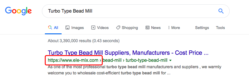 接下來,我們一起看看客戶網(wǎng)站在谷歌上的排名情況,首先搜索關(guān)鍵詞銷式球磨機(jī)“Pin Type Bead Mill”,我們發(fā)現(xiàn)客戶的網(wǎng)站在谷歌首頁有2個排名展位,俗稱“首頁霸屏”